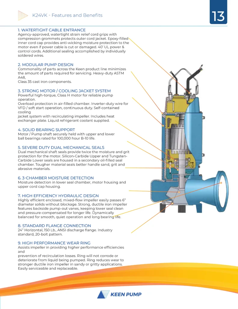 KEEN PUMP “K24VK” Series pumps are designed for demanding wastewater, municipal sewage treatment plants, storm water, industrial, commercial and a wide range of water-handling applications.