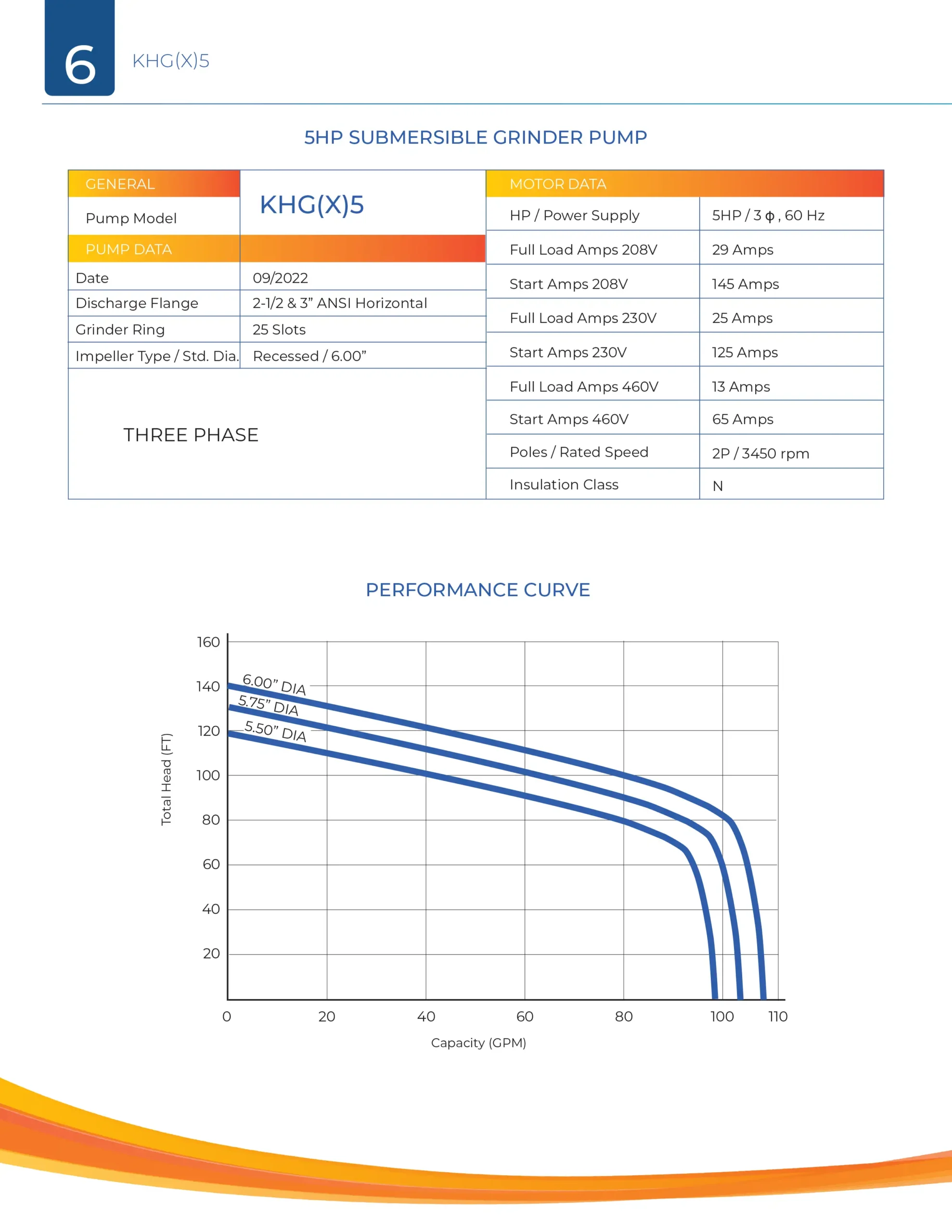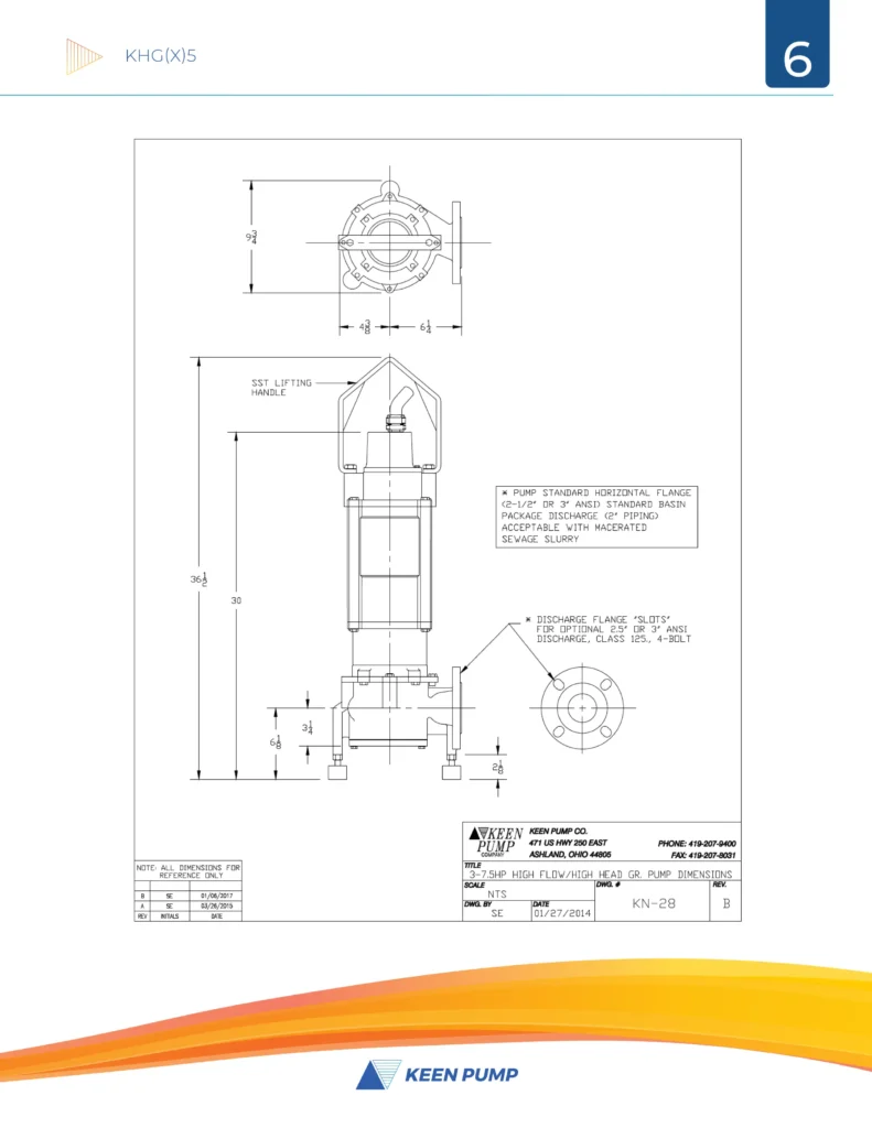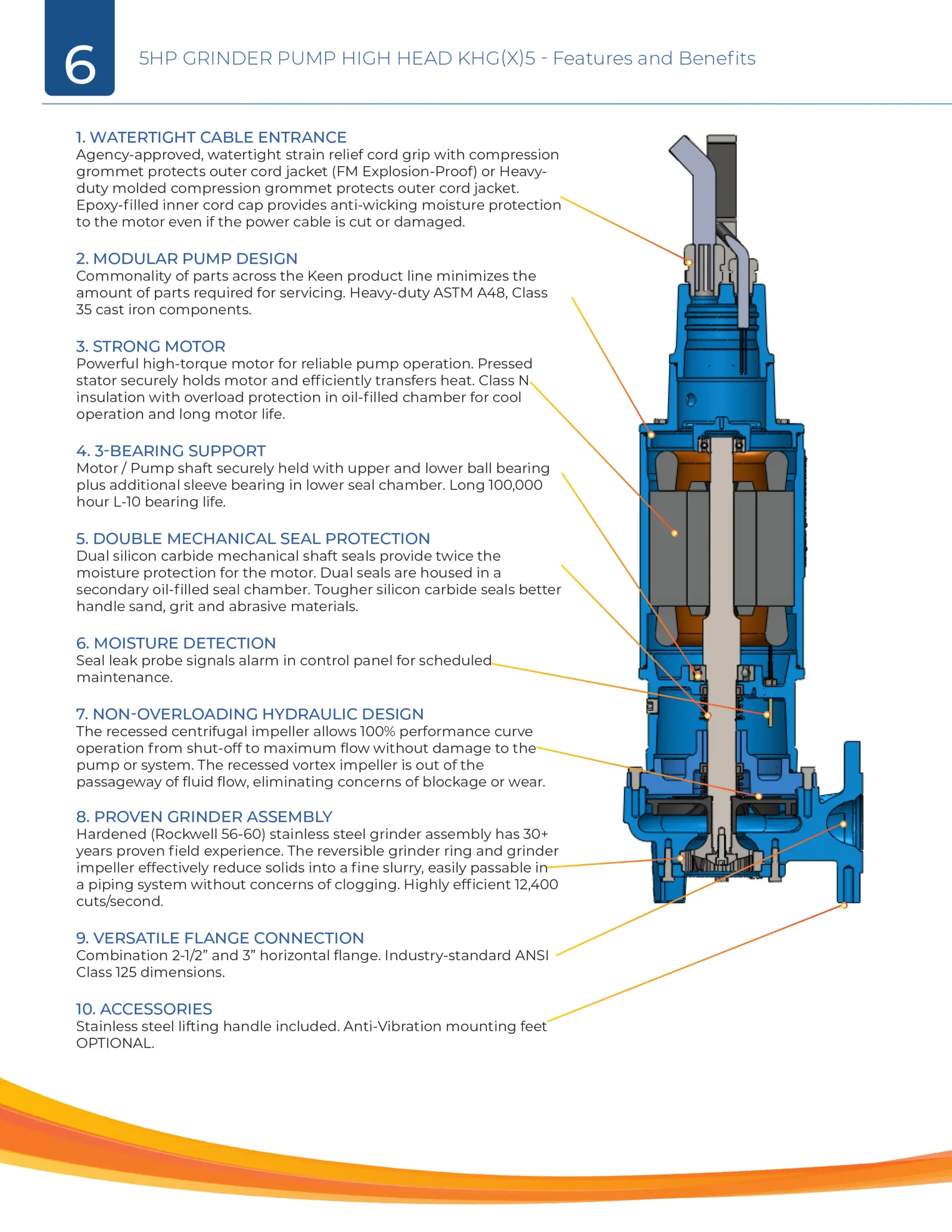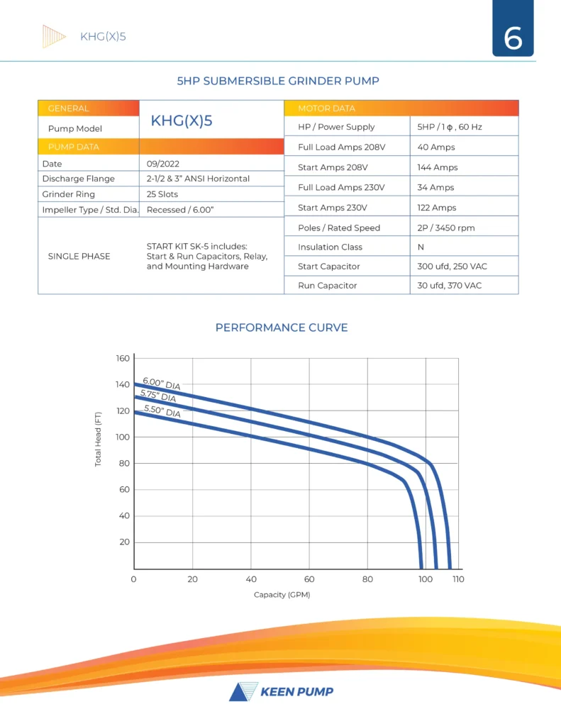 The KEEN PUMP KHG(X)5 series centrifugal grinder pumps easily handle residential, commercial or industrial sanitary waste, reducing it to a fine slurry. The KHG(X)5 pump is designed for use in pressure sewer applications or any piping network. The recessed vortex impeller design of the KHG(X)5 grinder pump provides troublefree, non-overloading operation over the entire performance curve. The modular design provides quick and easy serviceability. The hardened stainless steel grinder assembly provides many years of dependable operation.